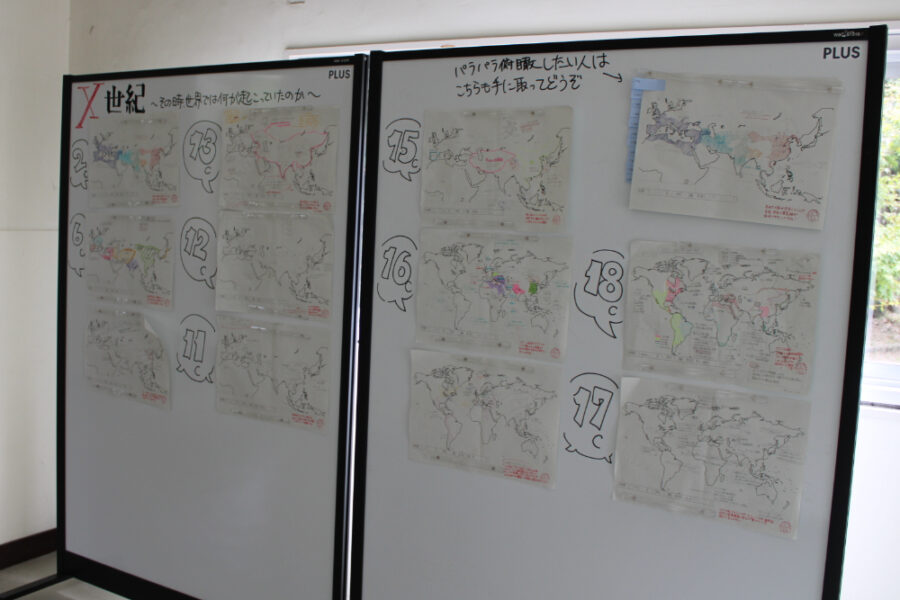 2025年10月31日見てわかる世界史!_色で紡ぐ世界の歴史ストーリー、北館入口に3年次生の白地図展示 2025年10月31日見てわかる世界史!_色で紡ぐ世界の歴史ストーリー、北館入口に3年次生の白地図展示