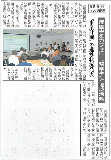 高梁高の生徒は、統廃合で廃園になる幼稚園をカフェとして活用する案について発表。「今後、飲食店に出店を要請していきたい」とした。台湾からの修学旅行生誘致を目指し、プレゼンの準備を進めていくことも明らかにした。