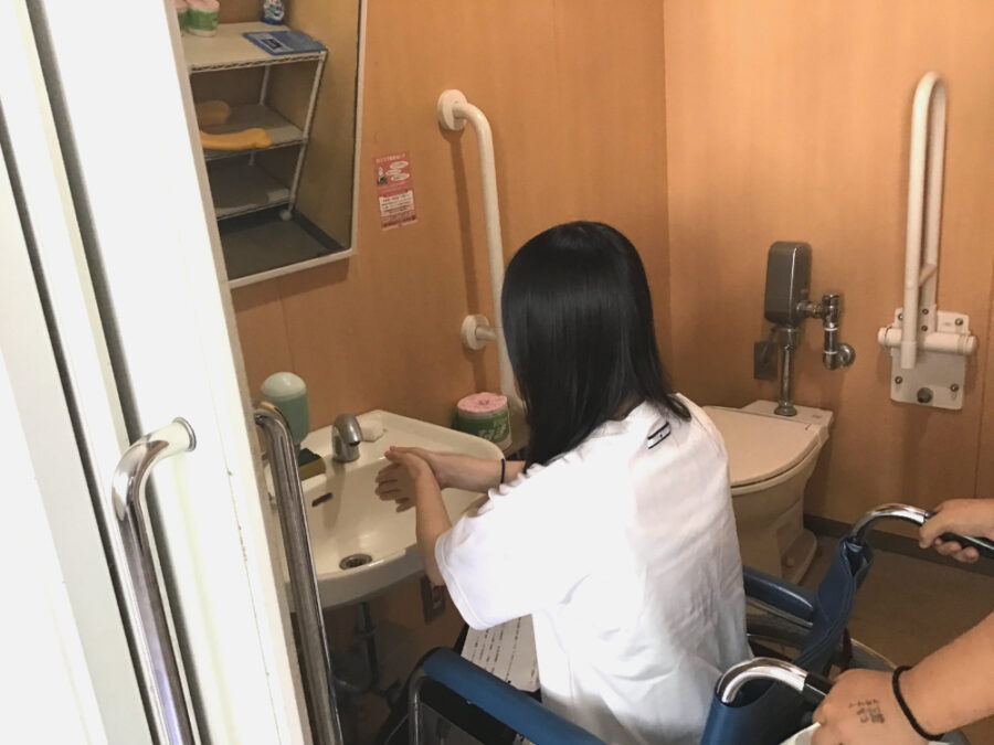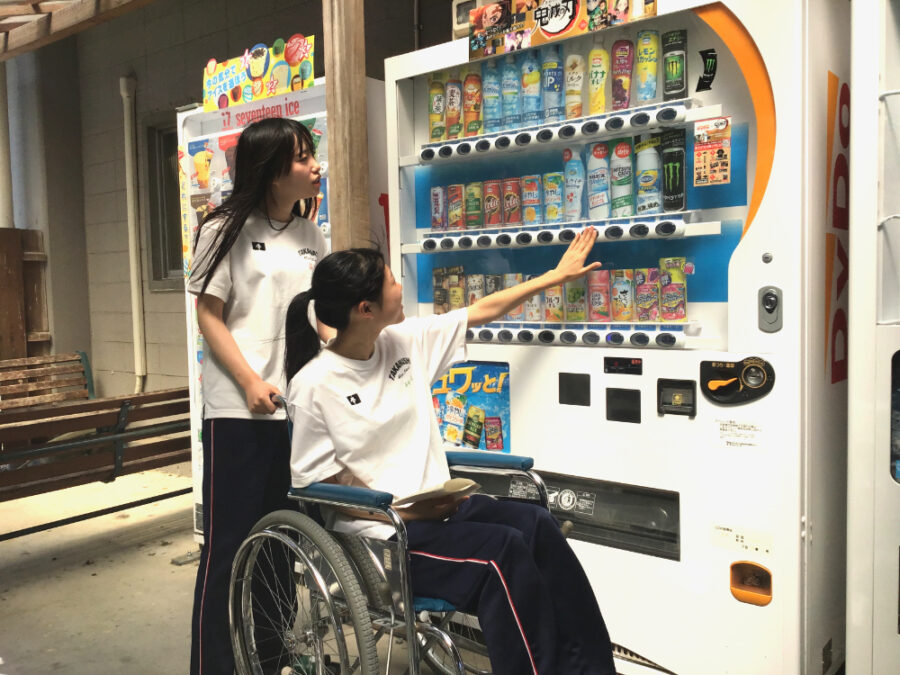 3人1組になり、「乗る人」「介助する人」「見守る人」を交代しながら、校内をぐるりと移動します。廊下やスロープ、ちょっとした段差、そして自動販売機やトイレなど、普段は何気なく使っている場所も、この日ばかりは新しい視点で見えてきました。