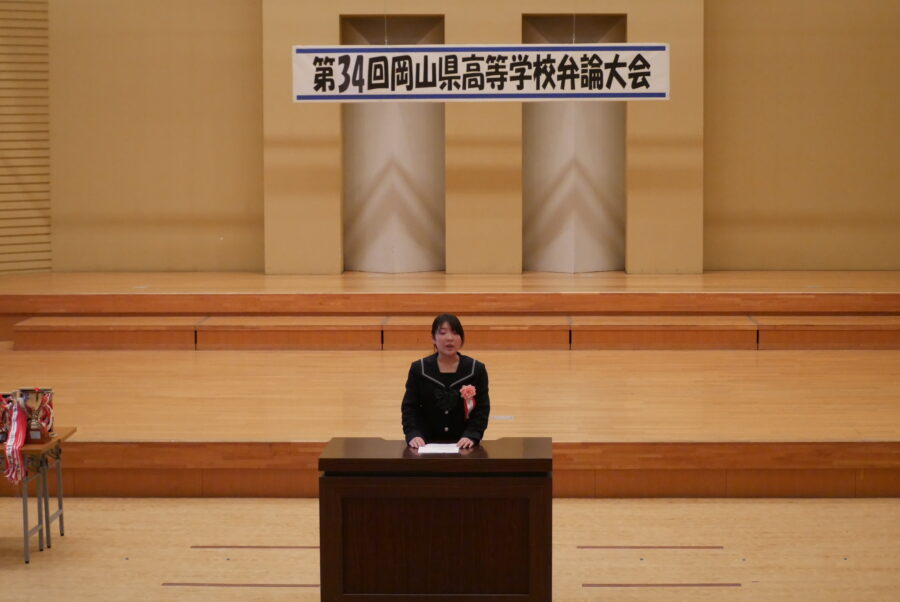 11月5日(火)に第34回岡山県高等学校弁論大会(岡山県高等学校文化連盟弁論部会主催)が、おかやま山陽高校生石ホールで開催されました。本校からは2年次の田口陽菜さんが出場し、「評価に囚われた私達」という題で約7分間の弁論を披露しました。