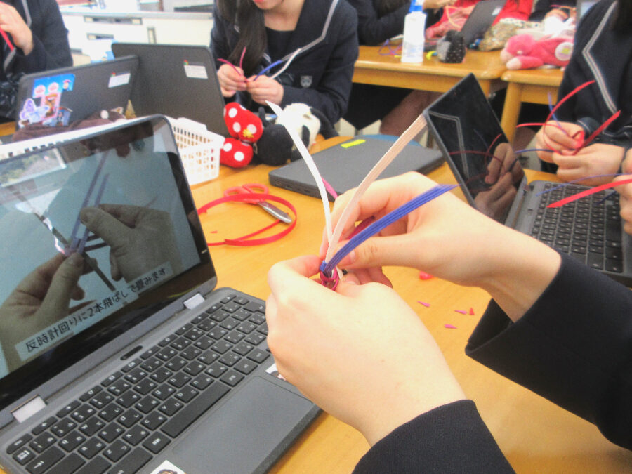 授業が始まると、生徒たちはさっそくクラフトバンドの色選びからスタート。ビーズの形や色も工夫しながら、オリジナルストラップづくりに取り組みます。細かな作業に苦戦する場面もありましたが、動画で確認したり友達と教え合いながら楽しく取り組んでいました。