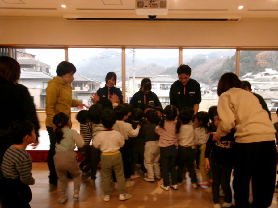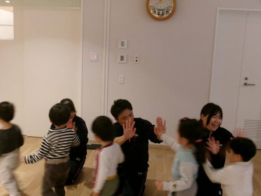 パネルシアターの後は、「おしくらまんじゅう」や「しっぽ取り」をして一緒に体を動かしました。元気いっぱいに遊ぶ子どもたちの姿を見て、生徒たちは「とても楽しかった」「もっと一緒に過ごしたかった」と話していました。