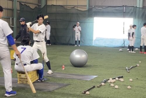 練習では、筋力トレーニングやウォーミングアップからバッティングまで、社会人選手ならではのスピード感や声かけに刺激を受けました。特にバッティング練習では、シティライト岡山の方から打ち方やフォームの指導を丁寧に受ける場面が多く、スイングや打球の質を改善する貴重な学びの時間となりました。選手も指導を受けながら実際に試すことで、多くの気づきを得ることができました。