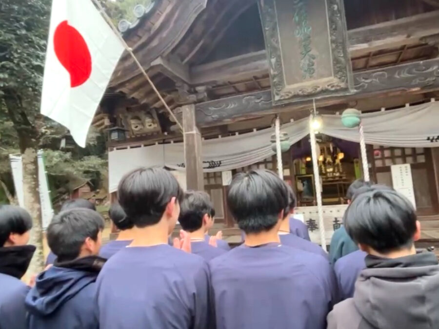 当日は練習に先立ち、部員全員で高梁稲荷神社および備中松山城を訪れ、一年の無事と目標達成を祈願しました。高梁稲荷神社では、部員一人ひとりが真剣な表情で参拝し、それぞれの目標に向けた強い決意を新たにしました。