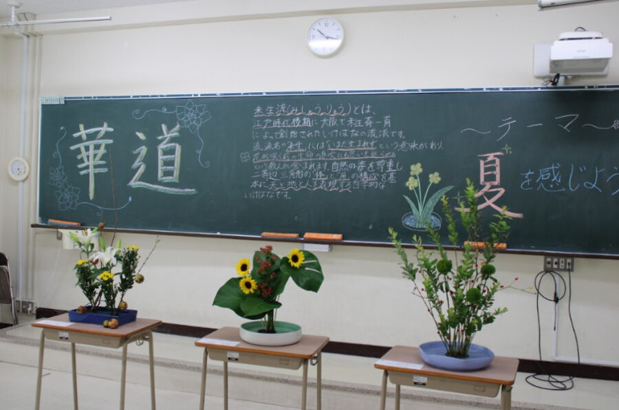 高梁高校の華道部では「未生流」という流派を習っています。未生流は江戸時代後期に、未生斎一甫によって創流されました。伝統と古典の優美を備えた格花(かくばな)とその伝承と現代の優美を目指す新花(しんか)という生け方があり、華道部では主に新花を勉強しています。