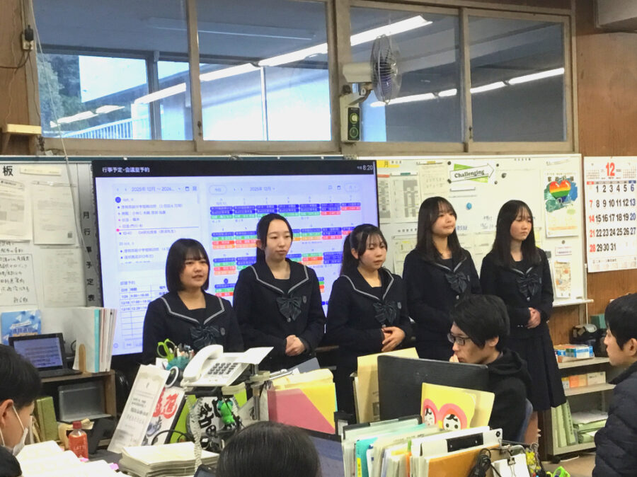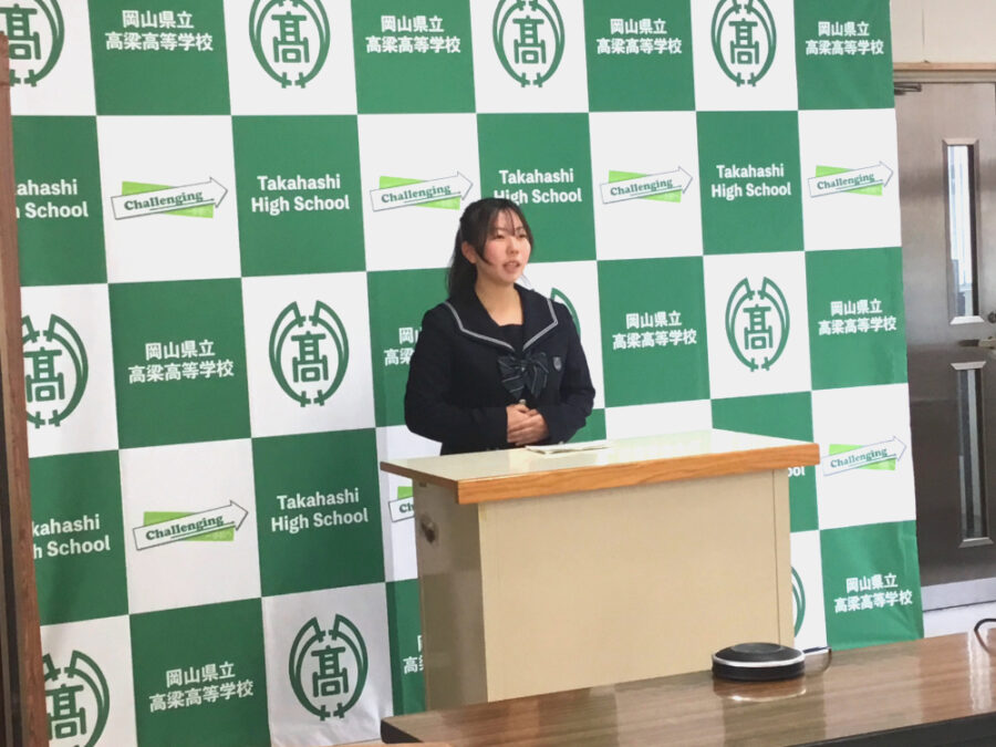 今回立候補したのは、家庭クラブ長に2年次生の原田心美さん、副クラブ長に同じく2年次生の井原美咲さん、そして1年次生の溝手愛結さん。それぞれがこれからの家庭クラブ、そして高梁高校をより良くしていきたいという強い意気込みを語ってくれました。