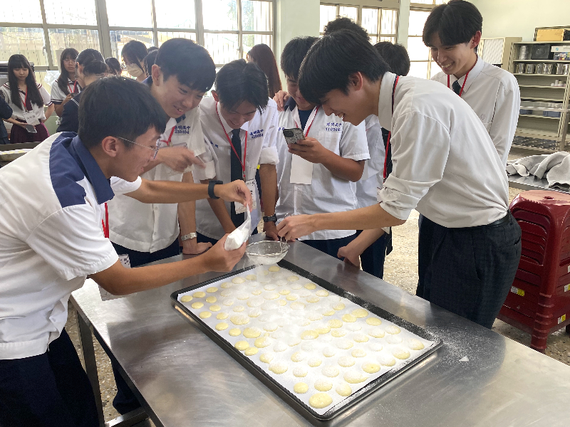 家庭科室では、パイナップルケーキと台湾マカロン作りに挑戦しました。甘い香りに包まれながら、港明高校の生徒たちと協力して作業を進め、言葉の壁を越えた交流が自然と生まれていました。