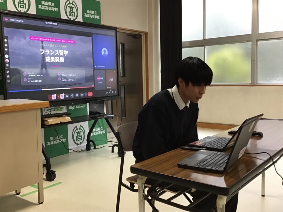 また、「トビタテ!留学JAPAN 新・日本代表プログラム高校生コース第10期生」に採択された杉浦史規さんのフランス留学成果発表がありました。「トビタテ!留学JAPAN」とは文部科学省が主導する官民協働の留学支援キャンペーンで、意欲ある日本の高校生・大学生が「新・日本代表プログラム」を通じて、成績や語学力不問で返済不要の奨学金を得て、実践的な海外留学に挑戦できる制度のことです。応募までの流れや、現地での活動などを写真を交えて話してくれました。