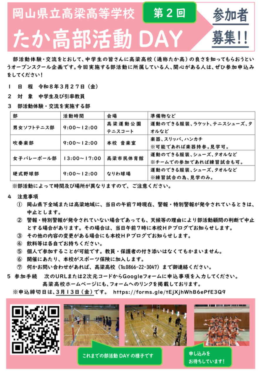 今回は、吹奏楽部、男女ソフトテニス部、女子バレーボール部、硬式野球部の4つの部活で中学生を受け入れます。高梁高校に興味のある方、部活動の雰囲気を味わってみたい方は、是非参加してください。