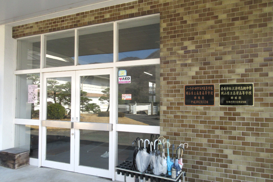 2月13日(金)、高梁高校本館正面玄関の右側の壁に、新たな歴史の1ページを刻むプレートが設置されました。台湾・台南市にある**台南市私立港明高級中學**との姉妹校締結を記念するものです。