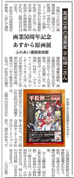 会期中の10月5日午後1時から、市川上総合学習センターで平松さんのトークショーがあり、就任が決まっている同漫画美術館の名誉館長委嘱式も行う。無料。定員300人。優先席は事前予約が必要。