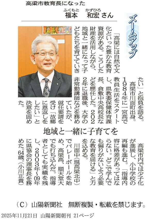 高梁高校卒業生・福本和宏さん(昭和55年普通科卒)が高梁市教育長に就任され、11月21日の山陽新聞で紹介されました。