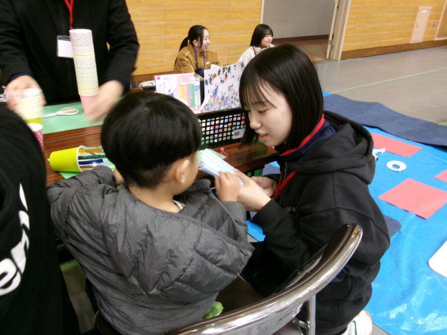 当日は、本校生徒が考案した手作りおもちゃのブースで、「くるくる紙コップ」と「紙皿ヒコーキ」を作りました。子どもたちは夢中になって取り組み、会場は笑顔であふれていました。
