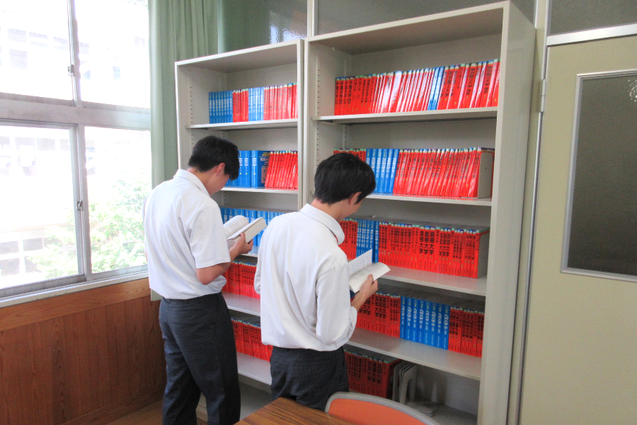 本館2階にある「進路学習室」は、赤本をはじめとした受験対策資料や進路関連の情報がそろう、いわば“未来への扉”。朝早くから訪れる生徒も多く、放課後には自習を目的とした生徒たちでにぎわいます。